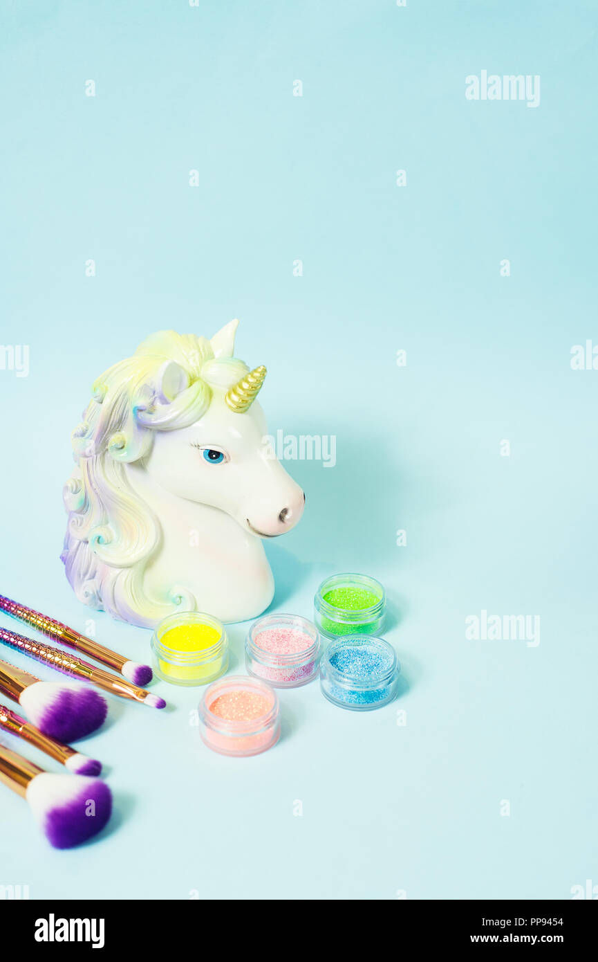Leiter Ein Einhorn Und Glitzer Lidschatten Auf Blauem Hintergrund Stockfotografie Alamy